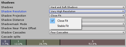 Stable fit表示阴影渲染将尽可能的使阴影边缘稳定,这意味着当相机或者光移动时阴影不会再有闪烁的现象,当然这也会使得阴影质量降低。
