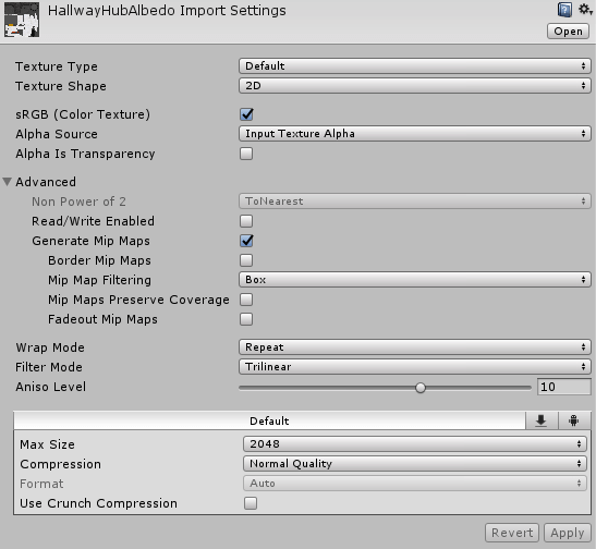 与网格(LOD组)的距离等级(LOD)解决方案类似,纹理的LOD解决方案称为mipmapping(纹理映射),随着相机距离的增加mipmapping可以自动降低显示纹理的分辨率,这会显著提升缓存效率,提高性能,降低带宽等,按照下面的截图来设置mipmaps: