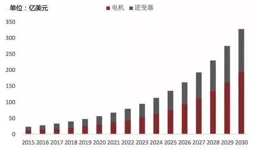 新能源汽车电机系统主要包括电动机和逆变器两部分,虽然同其他大部分汽车零部件一样,这两部分部件长期都面临降价压力,但是由于新能源汽车总量的上升,行业总体还是具备较大上升空间。我们预期到2030年市场规模年均增速将在18%-20%左右。