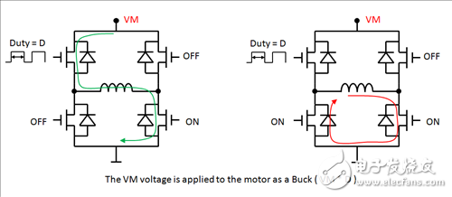 在这里我们需要一些DC/DC电源管理背景资料以了解泵升机制。因此,让我们来看看典型的降压 — 升压电路是如何工作的;请参阅图2。有趣的是,在PWM控制过程中使用H桥驱动电机时,您能同时看到降压和升压的过程。如图3所示,在PWM的开通时间段,它是一个典型的降压电路。而图4中,在PWM的断开时间段,对反电动势(EMF)而言,则充当升压机制中的输入电源。