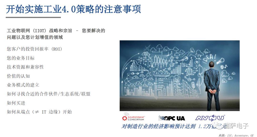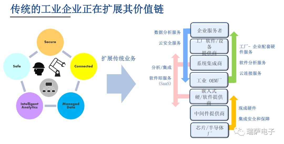 整个传统业务的价值链从最底层开始,瑞萨电子就类似于最底层的芯片级、半导体厂商,往上是一些中间电子提供商,再往上就是一些嵌入式软硬件提供商、OEM厂商、系统集成商、设备提供商,最后是企业服务者。举个例子,比方说现在的OEM厂商要连入工业4.0的话需要接入类似于云服务、软件分析服务。半导体厂商要集成更多的安全性或将通信安全协议集成到新硬件里面去。另外系统集成商不仅仅提供了软硬件的集合,同时也提供了一些软件级服务,比如SaaS。所以,整个产业链可以看到不同决策级的玩家或者生态链里面的伙伴,由于工业物联网要素的改变导致整条产业链会向上或者向下进行一个延伸,这是非常关键的一个价值链。