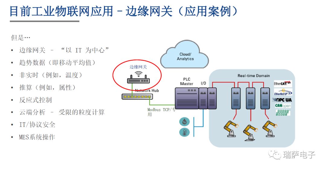 为此,我们提出一个解决方案,在OT端接入了一个实时工业物联网的网关,这个网关同时可以实现传统工业以太网协议,也同时可以兼顾实时数据在工业领域的一些控制,包括机械手、传感器等等,将本地的数据跟云端的数据进行分析,也打通了整个IT域跟OT域的融通关系。