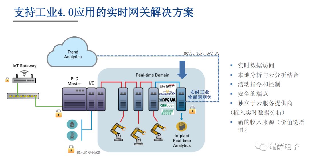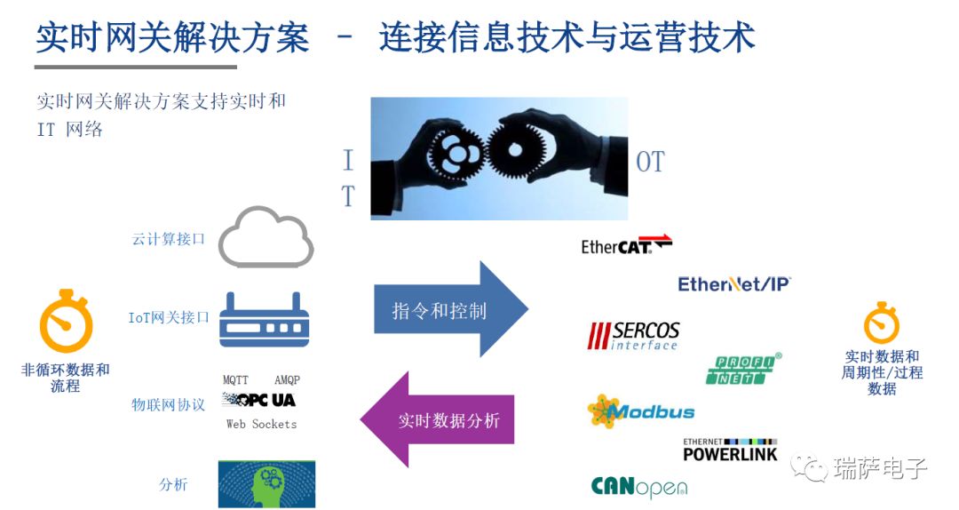 瑞萨电子提出如何将OT域运营技术这一端的数据以及我们常说的信息技术这一块的域融通起来,这里面包括了我们在工业领域常用到的一些工业以太网协议的数据,这些数据都是实时性数据,或者周期性、过程性的数据,这些数据如何实时传输到IOT的网关,让物联网的协议进行云端的分析。如何实现这个实时数据与指令控制相互反应交互,也是至关重要的。