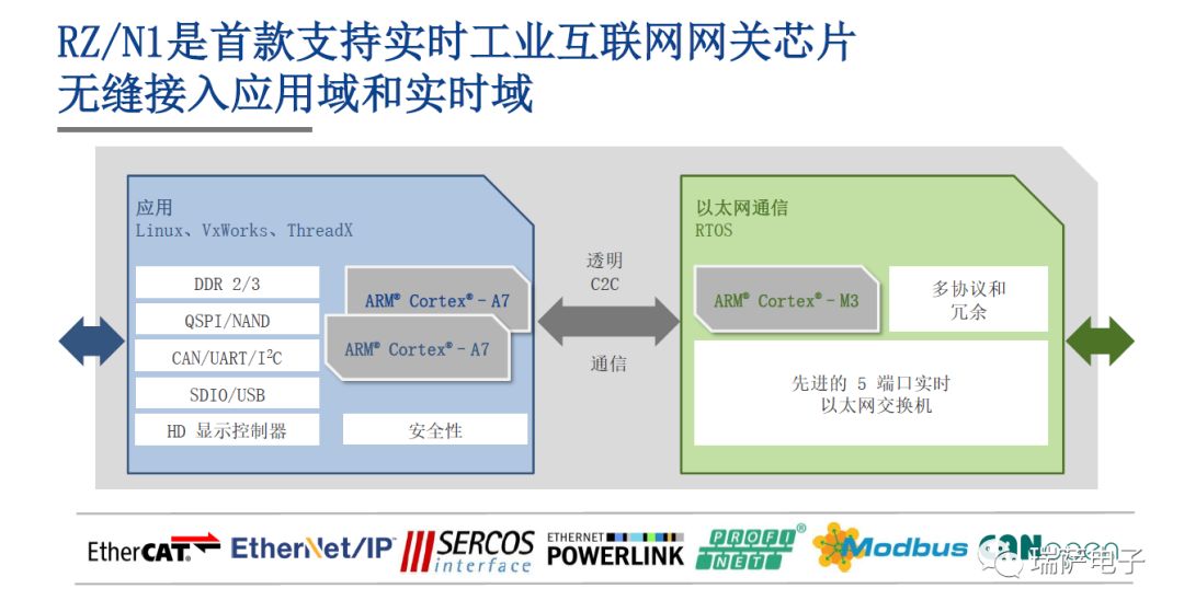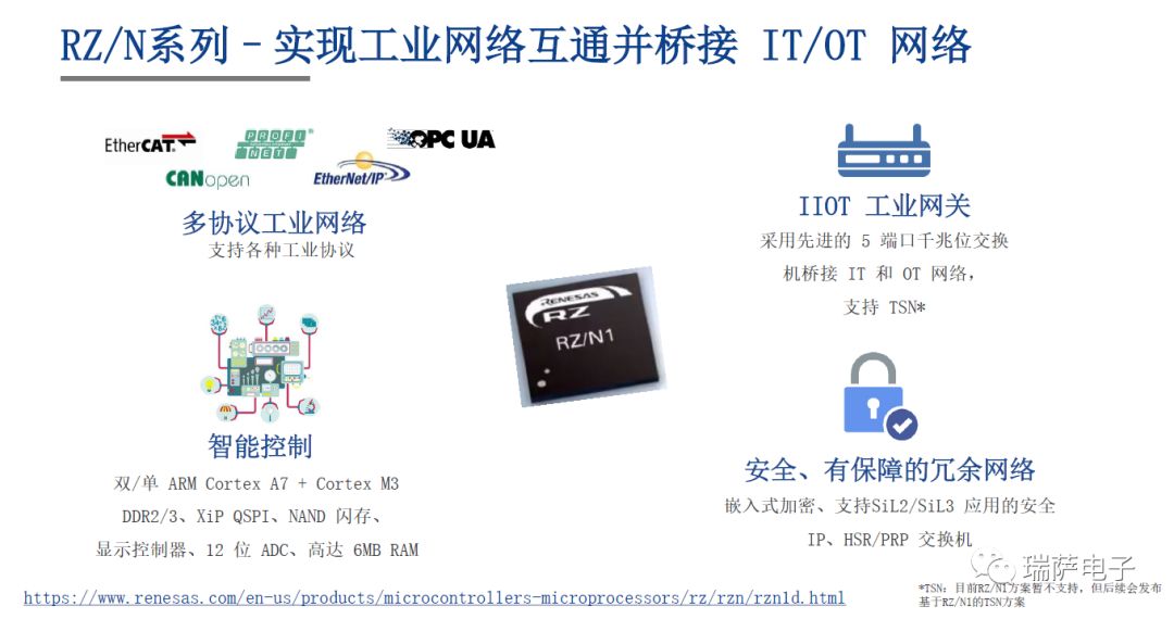 瑞萨电子提出了基于RZ/N的芯片,它是一个事先打通并桥接了两块域的解决方案,具备多协议工业以太网络和智能控制,提供了五端口的千兆位交换机,另外还具备一个安全的网络保障。智能控制会有一个内核,单核或者双核的ARM Cortex A7处理器,再加一个M3硬件实时操作系统的网络引擎。