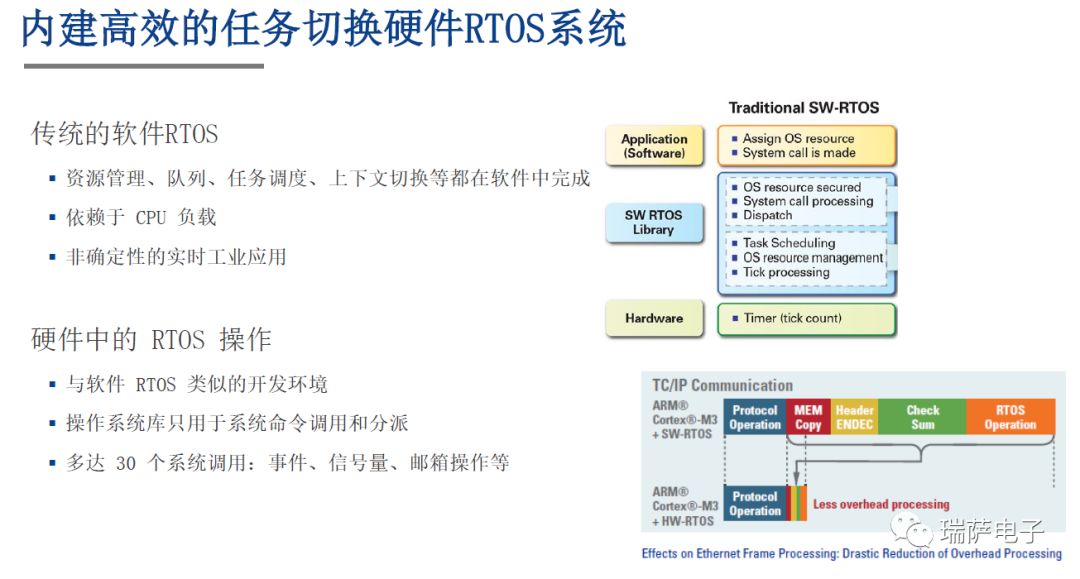 瑞萨电子的解决方案内嵌了一个RTOS系统,如下图。可以看到整个效率下降对比于软件操作系统会有更大的优势。硬实时系统是一个刚性的,不可改变的时间限制,它不允许任何超出时限的错误,超过时限的错误会带来整个系统的失败,所以我们叫硬实时系统,它区分于分时操作系统。分时操作系统会将资源平均分配,但为什么用硬实时系统?因为强调实时性。用软实时系统行不行?软实时是一个柔性灵活的实时系统,它可以容忍偶然的超时错误跟失败,并不会导致严重的后果。