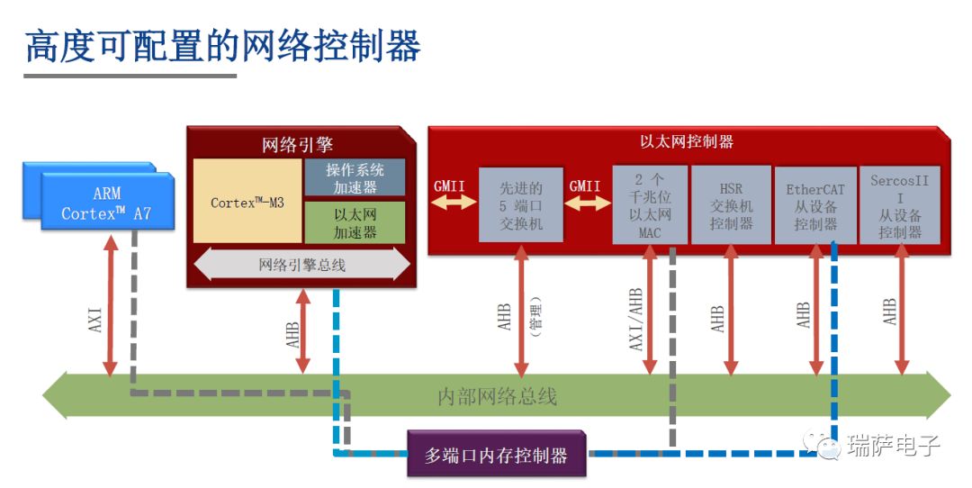 如何在使用以太网控制器跟总线进行一些交换数据,可以看到我们有一个内部的网络组织,在芯片内部实现的,所有应用层的数据通过这些总线与网络控制单元进行不同的一些数据交换。这个速度会非常快,比外围的数据交换快很多。