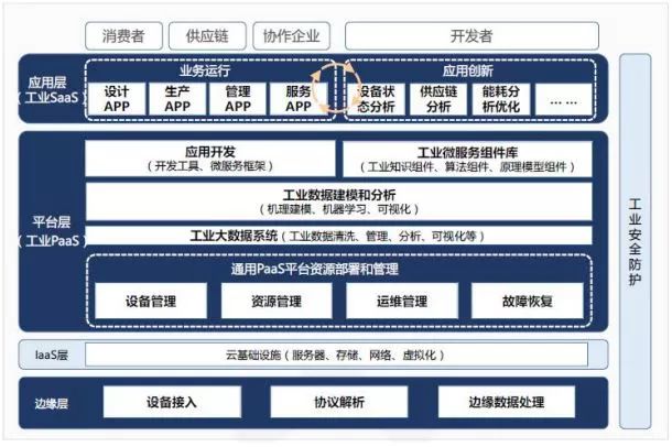 在工业互联网产业联盟提供的白皮书中将工业互联网平台从架构上具体划分为四个层次,即边缘层、IaaS层、工业PaaS层和工业SaaS层。其中,IaaS层主要是为PaaS层提供云基础设施支撑,以构建满足工业应用开发需求的硬件环境。工业与信息化部电子信息司副司长安筱鹏曾用三句话概括了工业互联网平台需要支撑的应用功能。