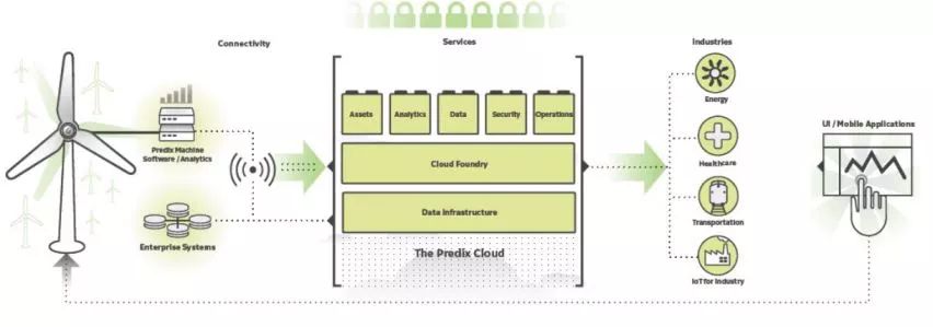 面对当前不同行业数据的分析需求,Predix分析服务提供开发框架,一个基于微软Cloud Foundry框架的PaaS开发平台,利用这个开发平台,企业可以根据需求自主开发算法和模型,在通过配置、抽象以及扩展模型用于管理分析算法的执行。由于多年在航空、能源、电力、医疗等行业的经验和数据积累,Predix平台内部集成了一些针对飞机发动机引擎、医疗数据、能源数据的算法和模型。除此之外,GE及合作伙伴还基于Predix平台开发部署了一系列工业APP应用,包括计划和物流、互联产品、智能环境、现场人力管理、工业分析、资产绩效管理、运营优化等。