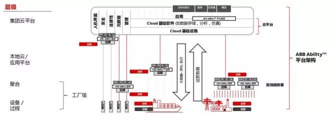 从产品白皮书提供的资料分析,ABB Ability可按照“金字塔型”划分为四个层次,分别是底层的设备与传感器,中间层的自动化系统、端到端的工业/企业数字化解决方案,以及最上层的开放的工业云平台。从四层架构体系看基本涵盖了工业互联网平台定义的功能。