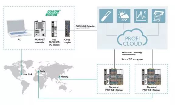 对于实现设备之间的互联,ProfiCloud工业云平台主要通过一种叫做ProfiCloud耦合器的设备安全地将本地PROFINET网络连接到ProfiCloud云平台上,同时也使ProfiCloud服务可以在PROFINET中使用。对于远程的设备则可以采用分布式控制器通过互联网与ProfiCloud相联接。它就像PROFINET网络中的一个本地设备一样可以直接使用,无需进一步的配置或编程。在ProfiCloud平台上远程的PROFINET子站甚至都不需要控制器,所有的控制命令都可以由本地PROFINET控制器发出,这样为客户节约了大量硬件成本。
