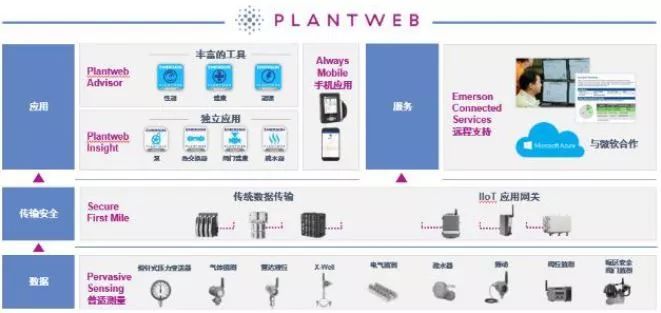 微软云服务和物联网方案:艾默生将基于云的Microsoft Azure 物联网套件进行了标准化,以实现Connected Services远程支持服务,使得Plantweb数字生态系统能够提供一个安全、灵活的平台,从而与企业内部云网络和第三方云服务连接。