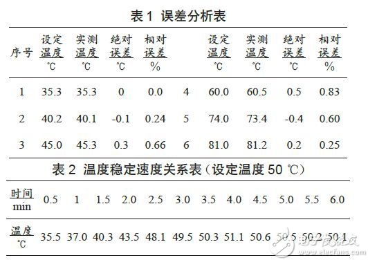 在电炉子中放入1 L 清水,电炉子和控制系统相连,给系统上电,系统进入准备工作状态。分别设定温度为35.3 ℃、40.2 ℃、45 ℃、60 ℃、74.0 ℃、81 ℃,观察设定温度和实际温度,并记录数据。填写表1,同时观察水温变化的动态情况,并记录温度稳定的时间,填写表2.