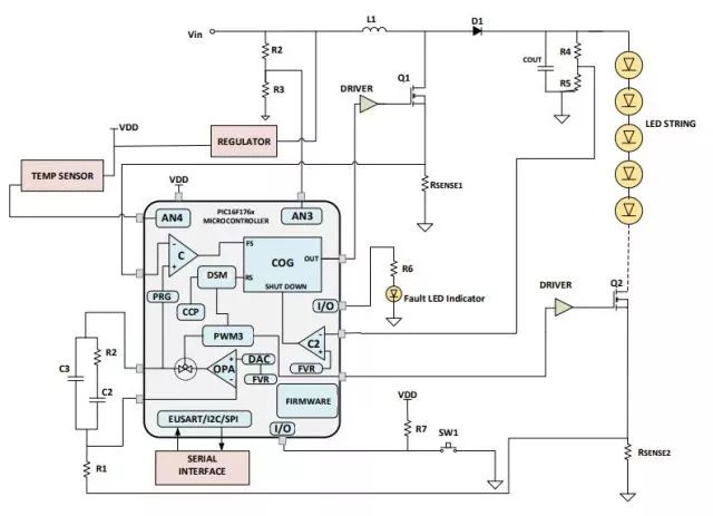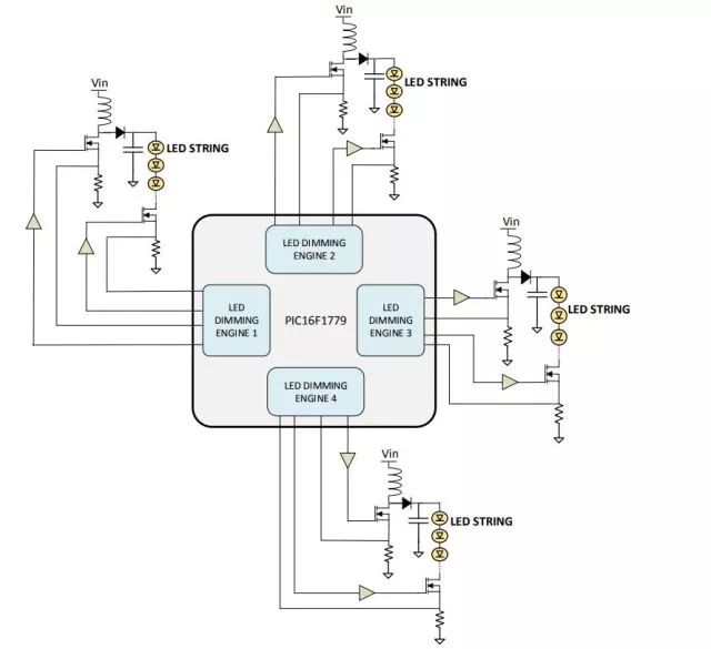 图1:通过Microchip的PIC16F1779 8位单片机控制四个LED串的图示