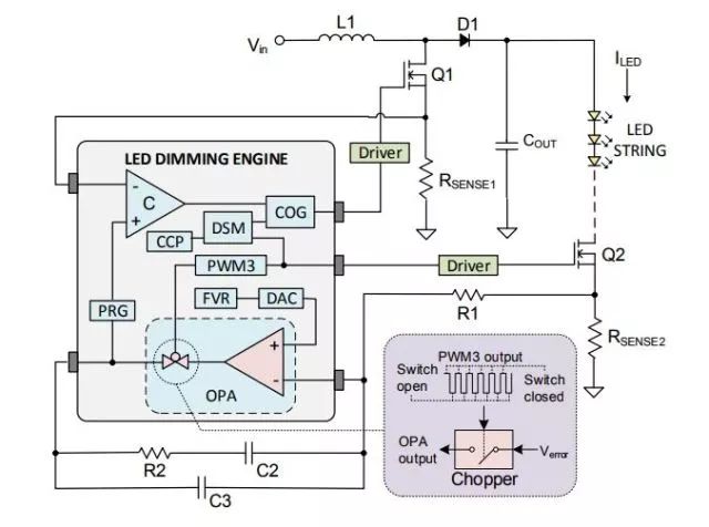 OPA模块实现为具有II型补偿器配置的误差放大器(EA)。FVR用作DAC输入,根据LED恒定电流规范为OPA同相输入提供参考电压。