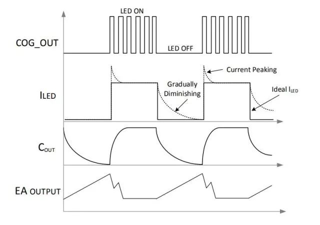 峰值电流当使用开关模式功率转换器驱动LED时,将采用反馈电路来调节LED电流。但是,如果在调光期间操作不当,反馈电路会产生峰值电流(见图3)。回顾图2,当LED点亮时,电流传输到LED,RSENSE2两端的电压馈送到EA。当LED熄灭时,没有电流传输到LED,RSENSE2电压变为零。在此调暗期间,EA输出会增加到最大值,并使EA补偿网络过充。当调制的PWM再次导通时时,如果有高峰值电流驱动到LED,则需要若干个周期才能恢复。此峰值电流会削减LED的使用寿命。