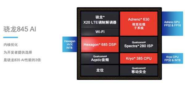 骁龙845采用最新的八核Kryo 385定制架构,性能比骁龙835的Kryo 280提升25%,三星第二代10nm工艺制程,主频最高为2.8GHz;其次骁龙845集成的Adreno 630 GPU性能比骁龙835的Adreno 540提升30%,功耗降低30%。另外,骁龙845集成了第二代千兆级LTE Modem——X20调制解调器,比骁龙835的X16速度提升20%,其集成的全新Hexagon 685 DSP与Spectra 280 ISP全面提升拍照功能。