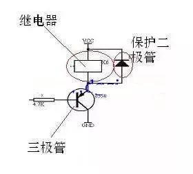 图上还有一个东西,是保护二极管,如果不需要深入理解的话,你大可不必追就为什么有它存在,但是一定得记住,只要是用三极管驱动继电器的场合,一般都有它的存在.需要特别注意的是它的接法:并联在继电器两端 阴极一定是接Vcc