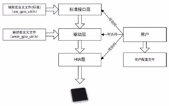 标准接口层对常见外设的操作进行了抽象,提出了一套标准API 接口,可以保证在不同的硬件上,标准API 的行为都是一样的。用户使用一个GPIO 的过程:先调用驱动初始化函数,后续在编写应用程序时仅需直接调用标准接口函数即可。可见,应用程序基于标准API 实现的,标准API 与硬件平台无关,使得应用程序可以轻松的在不同的硬件平台上运行。