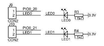 如图4.6 所示为AM824-Core 板载的2 个LED发光二极管,与MCU 的I/O 引脚通过J9 和J10 相连,其中的LED0 通过J9 与MCU 的PIO0_20 相连,LED1 通过J10 与MCU 的PIO0_21 相连。当I/O 输出低电平0 时,由于LED 阳极加了3.3V 电压(高电平1),因而形成了电位差,所以有电流流动,则LED 发光二极管导通,即LED 发光;当I/O 输出高电平1 时,由于无法形成电位差,则LED二极管不导通,即LED 熄灭。