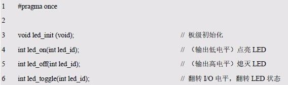 电阻R3、R4 的作用是防止产生过电流而烧坏LED,这是由电源电压和LED 的额定电流决定的LED 电学特性而接入的,当LED 的电压超过1.5V 时,电流将急剧增加,所以必须避免出现这样的情况。在数字电路中,当输出为高电位时,则电流流到负载上;当输出为低电位时,则从负载一侧吸入电流。前者的电流叫作源电流,后者叫作吸收电流。显然LED只有点亮、熄灭和翻转3 种操作,可以直接调用接口函数实现,led.h 接口文件的内容详见程序清单4.1(各接口具体的实现在第4 章中会详细介绍)。