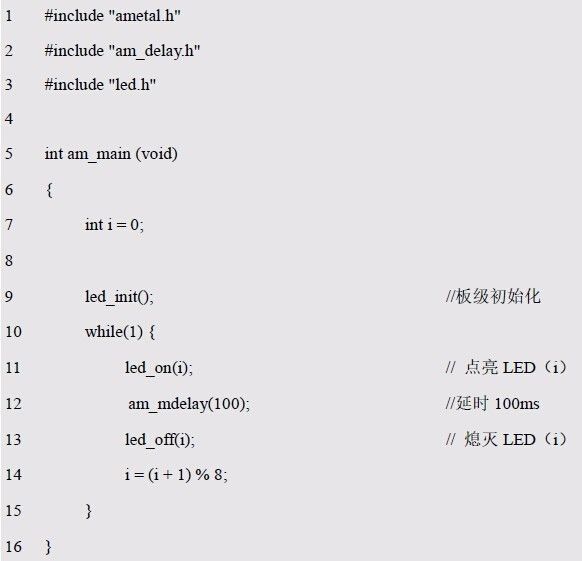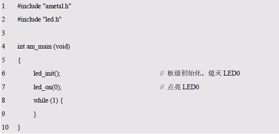 其中,led_id 是LED 的编号,AM824-Core 板载LED 的编号分别为0 和1。事实上程序设计的依赖倒置原则不一定要包含函数指针或抽象类型数据,当调用led_on()和led_off()点亮或熄灭LED 时,就使用了依赖倒置原则。它本来可以与I/O 的内存映射直接交互,却将直接访问抽象成了接口。那么针对接口的编程不妨就从点亮LED 开始,详见程序清单4.2。