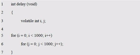 LED 闪烁就是让LED 不停的亮灭,因为计算机指令的执行速度非常快,其执行时间是微秒级的,所以在微秒之间点亮和熄灭LED,眼睛是看不到闪烁现象的。如果想让人眼看到LED 闪烁,就必须将LED 点亮和熄灭的停顿时间扩大近秒级别。如何实现停顿呢?点亮LED 后,先不要熄灭LED,而是先延时一会儿,让“点亮LED 后,再保持一段时间”,然后再熄灭LED。在实验之前,我们需要延时函数,它在C 语言中是怎么实现呢?很简单,就是让MCU 执行一些没有任何实际意义的空循环指令,进而等效于延时。延时范例程序详见程序清单4.3,该程序中,MCU 大约就要执行1000000 条空指令。