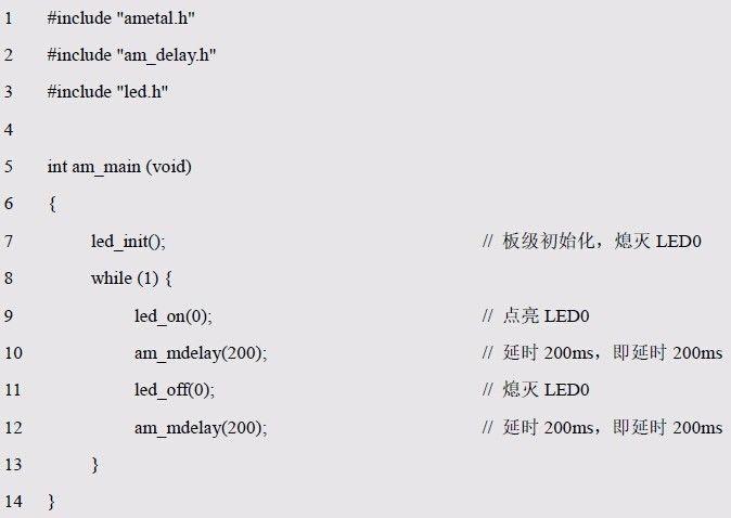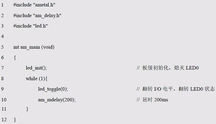 其实LED 不停地闪烁就是让一个I/O 不断翻转的过程,而AMetal 软件包针对LED 提供了翻转LED 状态的函数led_toggle(),优化后的代码详见程序清单4.5。