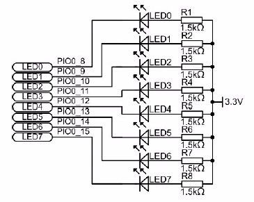 MiniPort-LED 模块集成了8 个LED,均为低电平有效,分别通过PIO0_8~PIO0_15 控制,其中的R1~R8 为LED 的限流电阻,详见图4.7。
