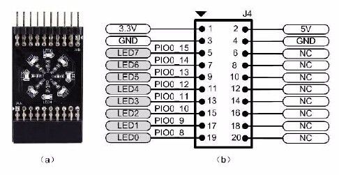 LED 模块通过MiniPort B(排母)与AM824-Core相连,同时将其余不使用的I/O 通过MiniPort A(排针)引出,实现模块的横向堆叠,其对应AM824-Core 的MiniPort 接口J4 的功能定义详见图4.8。