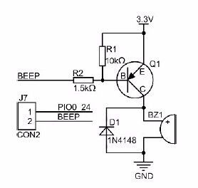 如图4.9 所示为无源蜂鸣器电路原理图,只要短接J7_1 与J7_2,则蜂鸣器接入PIO0_24。当PIO0_24 输出低电平时,则三极管导通,向蜂鸣器供电;当PIO0_24 输出高电平时,则三极管截止,停止向蜂鸣器供电。因此只需要轮流切换PIO0_24 的电平状态,就可以控制蜂鸣器的“通电”和“断电”,即以一定的频率翻转PIO0_24 的输出电平。其实接通和断开“一段时间”的总和就是蜂鸣器的振荡周期,再稍作转换就能够得到确定的音频脉冲频率参数。从而产生机械振动音,只要频率在人耳听觉范围内,即可听到蜂鸣器发声。
