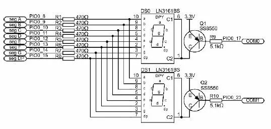 如图4.10 所示是由2 个共阳极的LN3161BS 组成的LED 数码管电路,R1~R8 为限流电阻,c1 和c2在内部并联连接。如果将段选端a~dp 与位选端com0、com1 连接到AM824-Core 的PIO0_8~PIO0_15 与PIO0_17、PIO0_23,则通过程序即可控制笔段的亮灭。由于数码管的8 个段选端全部都要经过com 口才能得到供电,因此需要增加三极管提高com 口的驱动电流,以弥补LPC824 GPIO 驱动电流的不足。当com 为低电平时三极管导通,则数码管的c1、c2 为高电平,即选通数码管。此时只要数码管的任一段选端为低电平,则点亮数码管相应的笔段。