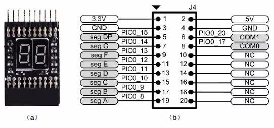 如果要显示多位数字,则需将多个数码管并接在一起使用。此时将会出现一大堆段选端的问题,比如,两位数码管需要2×8=16 个段选信号,而LPC824 一共才16 个I/O,无法满足需求,同时管脚使用越多,连线也会变得越复杂。所以为避免使用过多的管脚而造成资源浪费和连线复杂,人们发明了一种动态扫描方式来实现多个数码管的显示。