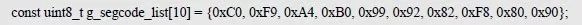 如果以8 位数值表示段码,当其相应位为0 时,则表示对应的段点亮。bit7~0 分别与dp~a 对应,假设bit0 为0,即点亮a。为了方便访问,不妨将段码存放到一个数组中。即: