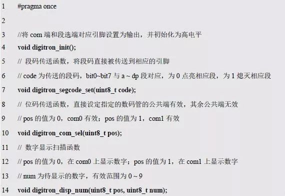 为了便于复用数码管程序,则将上述代码全部存放到digitron1.c 文件,函数声明放到digitron1.h 文件。其接口如下: