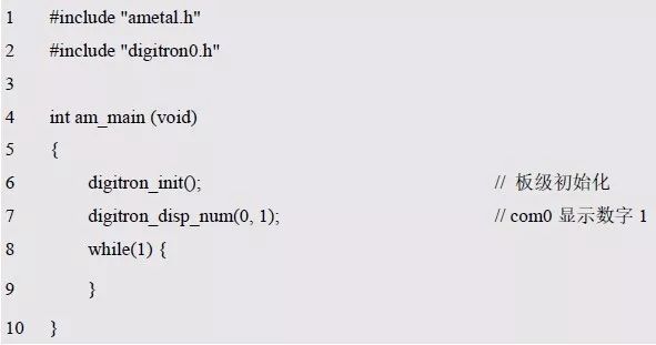 其中,code 为待显示数字0~9 所对应的段码,pos 为com0 或com1 对应的数字下标(0~1),num 为待显示的数字0~9。当后续调用这些函数时,则只需要“#include "digitron0.h"”就可以了。比如,在com0 数码管上显示数字1,详见程序清单4.11。