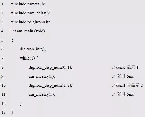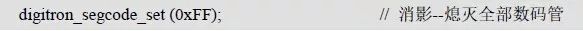 digitron_disp_num()就是digitron_com_sel ()和digitron_segcode_set()的一个简单组合。其显示过程是先传送位码、后传送段码,于是在传送位码和传送段码之间就产生了时间间隙。当新的com 端有效时,仍然还在使用此前的段码,所以出现了短暂的错误现象。怎么办?可以在这段时间内熄灭所有的数码管,避免错误显示。即: