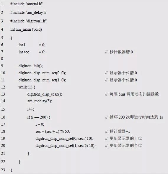 注意,在digitron1.h 接口中,已经使用digitron_disp_num_set ()和digitron_disp_code_set()替代digitron_disp_num()和digitron_disp_code(),程序清单4.18 就是通过迭代后的循环显示0~59 秒计数器范例程序。