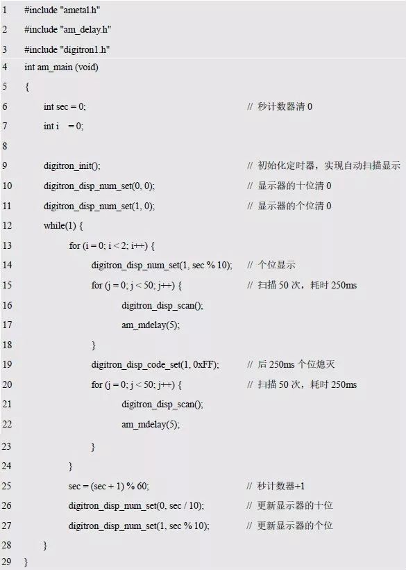 有了该接口函数后,实现闪烁就很容易了,程序清单4.25 实现了秒计数器个位闪烁。