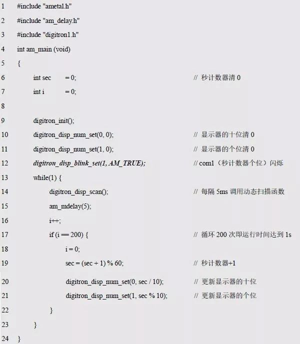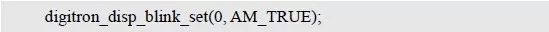digitron_disp_blink_set()的pos 用于指定设置闪烁属性的数码管位置,isblink 设置闪烁属性,值为AM_TRUE 表示闪烁,AM_FALSE 表示不需要闪烁。am_bool_t 是AMetal 在am_types.h 文件中自定义的类型,该类型数据的值只可能为AM_TRUE(真)或AM_FALSE(假),设定com0 闪烁的方法如下: