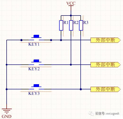 三是将按键接到外部中断引脚上,利用按键按下产生的边沿信号进行按键检测,如图1.3所示;