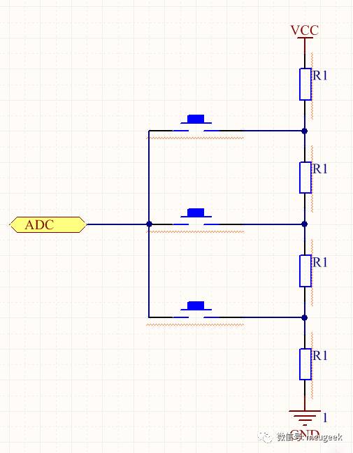 第四种的优点是,只需要单片机的一个ADC接口,一根线,就能对多个按键进行识别,缺点是按键一旦内部接触不良,则可能按键串位,且按键产生的抖动,会造成一定的识别错误。