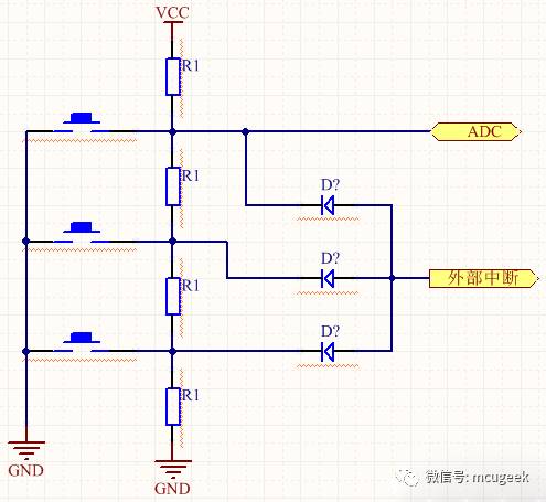 改进二:在原有的ADC按键的基础上,也可用增加二极管的方式,实现按键中断,并在中断服务程序里进行AD转换,从而识别按键。电路如图1.6所示。