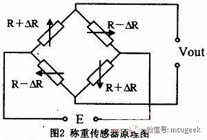 电阻应变式称重传感器是把电阻应变计粘贴在弹性敏感元件上,然后以适当方式组成电桥的一种将力(重量)转换成电信号的传感器。在电阻应变式称重传感器中通过桥式电路将电阻的变化转换为电压变化。电阻应变式称重传感器工作原理如图2所示。