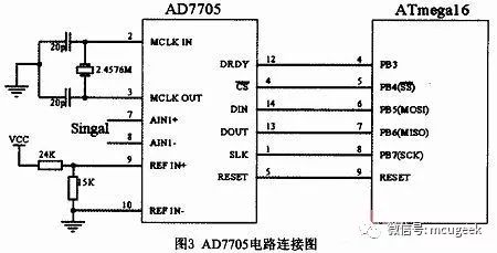 称重传感器输出的是mV级的电压信号,本设计采用AD7705对信号进行采集。AD7705是AD公司推出的一种基于∑-△转换技术的16位A/D转换芯片,它具有高分辨率、宽动态范围、自校准、优良的抗噪声性能以及低电压、低功耗等特点,适合于称重系统中微机信号处理的需求。其具有可编程增益放大器,增益范围1~128,可与压力传感器直接相连,使用同步串行SPI接口,可以与AVR单片机的硬件SPI接口直接相连,其电路连接图如图3所示。