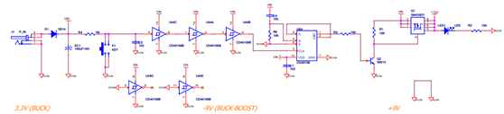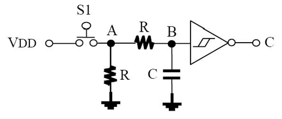 在S1 ON 的瞬间由于接触弹跳的关系,会使A 点电压呈现高速的断续现象,再S1 OFF时亦然,详(如图2所示),然而由于电容两端电压需由电压经电阻慢慢充电才会上升,使得B 点电位缓步上升情形:S1 OFF 时亦然,电容电压经R 放电,使B 点电压缓缓下降。此一变化,经史密特反相修整后,可得一标准负脉波输出,如波形图C 点所示。