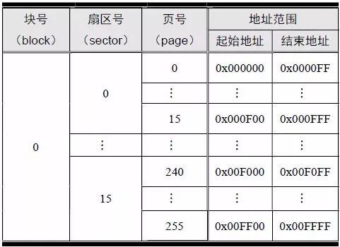 在MX25L1606 中,存储器有块(block)、扇区(sector)和页(page)的概念。页大小为256 字节,每个扇区包含16页,扇区大小为4K(4096)字节,每个块包含16 个扇区,块的大小为64K(65536)字节,其组织结构示意图详见表6.5。