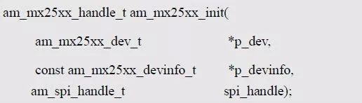 该函数意在获取器件的实例句柄mx25xx_handle。其中,p_dev 为指向am_mx25xx_dev_t类型实例的指针,p_devinfo 为指向am_mx25xx_devinfo_t 类型实例信息的指针。