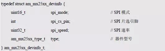 实例信息主要描述了具体器件的固有信息,即使用的SPI 片选引脚、SPI 模式、SPI 速率和器件具体型号等,其类型am_mx25xx_devinfo_t 的定义(am_mx25xx.h)如下: