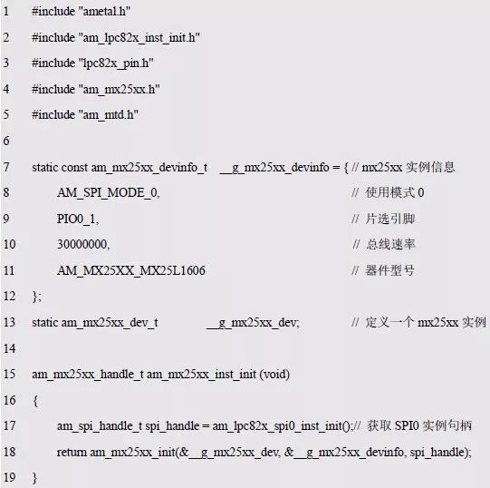若使用LPC824 的SPI0 与MX25L1606 通信,则通过LPC82x 的SPI0 实例初始化函数am_lpc82x_spi0_inst_init()获得SPI 句柄。即: