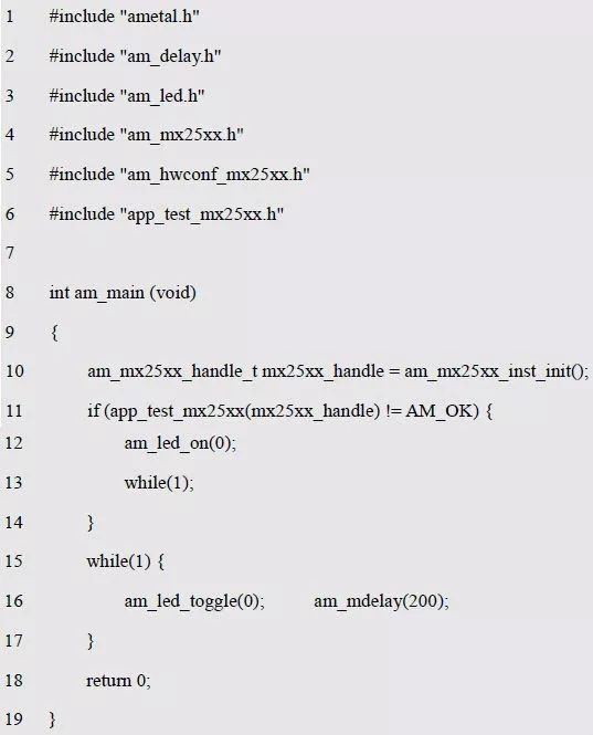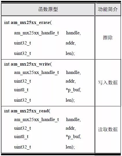 AMetal 提供了支持常见的MX25L8006、MX25L1606……等系列SPI Flash 器件的驱动函数,使用其它各功能函数前必须先完成初始化,其函数原型(am_mx25xx.h)为: